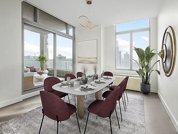 Entering through the large foyer, you are greeted to a home with 10 foot ceilings, oversized windows throughout with multiple exposures. An immense living room that offers flexibility for dining and entertaining with a large terrace overlooking the East River as well as stunning views that stretch all the way to 1 World Trade.