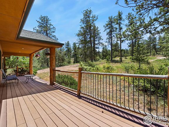 Come on Home to this mountain cabin situated on 3.95 private acres in beautiful Glacier View Meadows. Tucked away into tall pines with a circle driveway, this property promises tranquility & privacy, making it the perfect getaway or year-round home. Brand new interior paint, Korlok Luxury Vinyl Tile throughout, new ceiling fans/light fixtures installed in 2025, everything is clean and move-in ready. Beautiful, vaulted T & G ceilings with wood beams add to the rustic ambiance together with the log details on the front deck. The patio door lets the outside in and beckons you to go outside and sit awhile. Front & back decks, with composite decking, provide space to relax, entertain, enjoy star-filled night skies or simply take in the scenery. (it's not unusual to see wild turkeys, or deer strolling by to say hello.) There is also a mobility ramp on the back deck near a parking area, if needed. Imagine cozy evenings by the crackling wood-burning stove or sitting at the dining room table enjoying the view with your favorite morning beverage. The kitchen has plenty of cabinetry plus there is a large pantry in the adjacent laundry room with lots of extra storage. The Primary suite with an attached bath, also has an added walk-in closet with shelving. A good-sized 2nd bedroom (14 X 11) is separated from the primary bedroom by the main living areas. Both bedrooms have new ceiling fans installed to keep you comfortable all year round. There's a storage shed with room for your tools & gear-perfect for ongoing projects or weekend adventures. The HOA provides year 'round road maintenance, 3 small fishing ponds & area hiking trails. A full-service restaurant/bar and horseback riding are nearby. Glacier View is within 20 minutes or less from National Forests, Red Feather Lakes restaurants & stores and an easy 50-minute commute to Fort Collins. Don't miss this opportunity to own a slice of mountain paradise, where every day you might feel like you're on vacation!