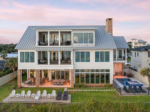 Sited on approximately 0.30 acres with 100 feet of pristine beachfront, the property exemplifies architectural refinement and superior craftsmanship. The three-story structure is clad in durable Hardie board with brick accents and crowned by a classic metal roof, reflecting both timeless coastal tradition and enduring quality.