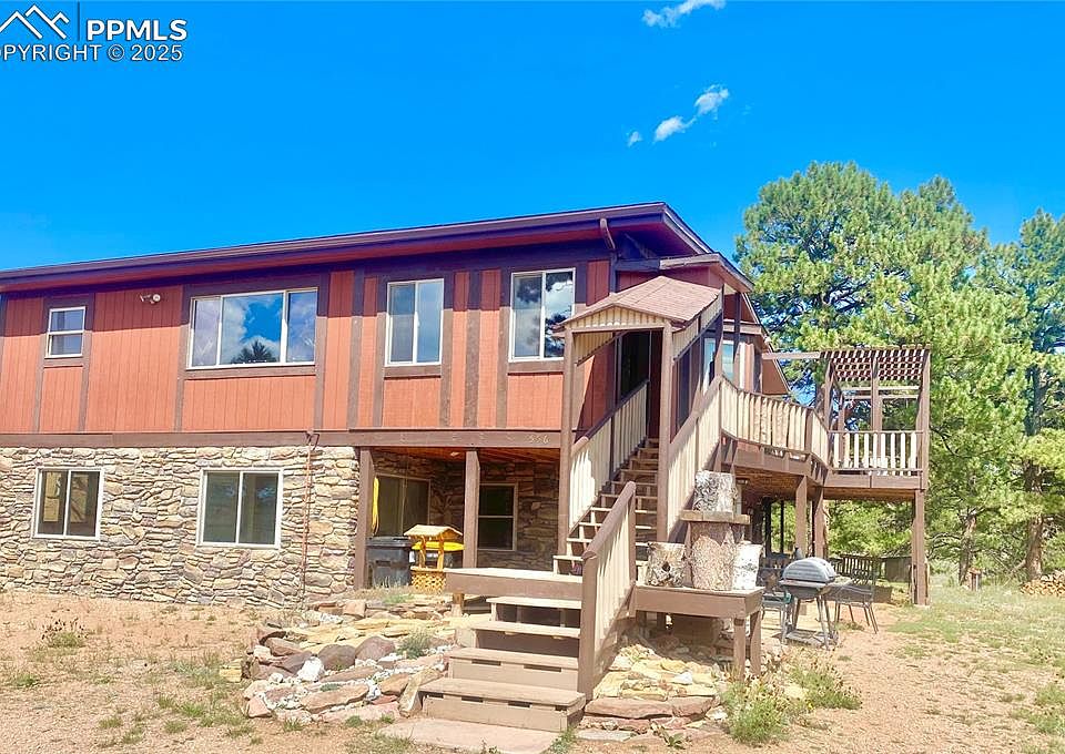 Immerse yourself in Colorado’s breathtaking beauty with this exceptional five-bedroom, four-bath home for sale in Florissant. Designed for those who crave tranquility, space, and connection to nature, this residence boasts a commanding view of Pikes Peak from your own expansive deck. Solar Panels included provide electricity for cost effective living. Contact Listing Broker for Video Tour! Thoughtfully designed living space where custom live edge trim sets a warm, elevated tone throughout. For ultimate flexibility, a well-appointed lower level guest suite allows for visitor privacy, short term rental ready or multi-generational living. The kitchen is a spacious heart of the home, ideal for the gourmet home chef. Every detail speaks to craftsmanship and thoughtful design. Embrace the Colorado lifestyle with a host of versatile outdoor and hobby spaces. A dedicated workshop prompts creativity, whether for woodworking, crafts, or weekend projects. Gardening enthusiasts will appreciate a greenhouse, perfect for year-round growing, while 2 storage sheds & carport offer generous spaces for equipment & seasonal items. All of this is set across three acres of fire mitigated land, providing unlimited opportunities for exploration, recreation, and even future expansion. This property is positioned to maximize privacy & views, offering a unique retreat while keeping you connected to the essentials of Florissant. Only a short drive away, you’ll find the Florissant Fossil Beds National Monument, National Forests and 11 Mile Canyon for outdoor adventures, and the Florissant Mercantile—your local hub for daily necessities. Opportunities like this do not come often—a residence where natural beauty, privacy, and versatility harmoniously align. If you’re searching for a property that inspires creativity, comforts the whole family, and connects you with Colorado’s finest landscapes, this home is not to be missed.