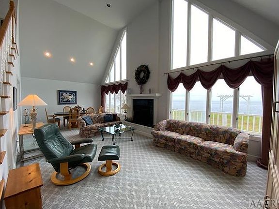Located on the Albemarle Sound, this home boasts a stunning living room w/ a wall of windows, cathedral ceiling, masonry fireplace & recessed lighting. Enjoy the views from the sunroom, screened porch or spacious deck (perfect for outdoor living). The custom kitchen offers beautiful cabinetry, ample counter space & room for a dining table. 1st floor owner suite w jet tub/separate shower. A 2nd bedroom/office on the 1st floor. Upstairs is an additional living room w waterviews, a 3rd bedroom, full bath & storage closets. Double attached garage, single detached garage & a storage building.