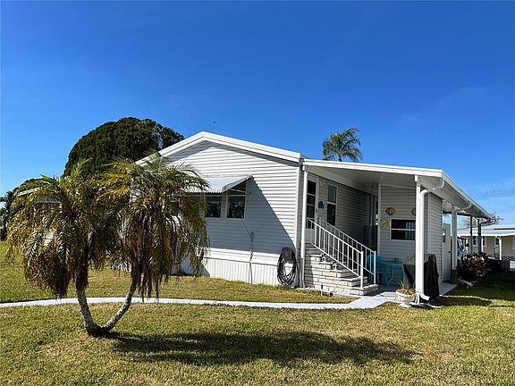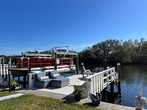 This 2 bedroom 2 bath waterfront home is move in ready and has 1,296 sq. ft. of living space. It has a composite dock and a lift, and looks over to the mangroves. It has a new vapor barrier and new AC ducts, the AC unit is 3 years old. The carport was new 2 years ago and there is parking under the carport for 2 cars as well as 2 spaces in the front of house. There is a separate laundry rom and a Florida Room. The furniture is negotiable as well as the 20' 1988 WOI Pontoon boat. This is a great opportunity to have a home with access to Tampa Bay. Price includes share for the lot and ownership in the co-op. Home is located in Americana Cove, a 55+, resident owned, waterfront community only 10 minutes from downtown St. Pete, 30 minutes from two airports and 25 minutes to Gulf beaches. Low monthly fee of $380 includes 24 hour manned gate, private streets, water/sewer, lawn moving/edging, trash pick up twice weekly and all amenities including heated pool, shuffleboard, bocce ball, two boat ramps and kayak launches well as many clubs and activities to get involved in. Two pets up to 35 pounds are welcomed.