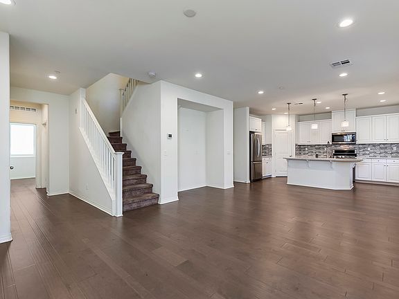 Designed with an open floor plan, this property offers recessed lighting, dual pane windows, and blinds throughout. The spacious kitchen is a chef's dream with quartz countertops, a stylish tile backsplash, stainless steel appliances, a large center island with a farm-style sink, and a generous walk-in pantry.