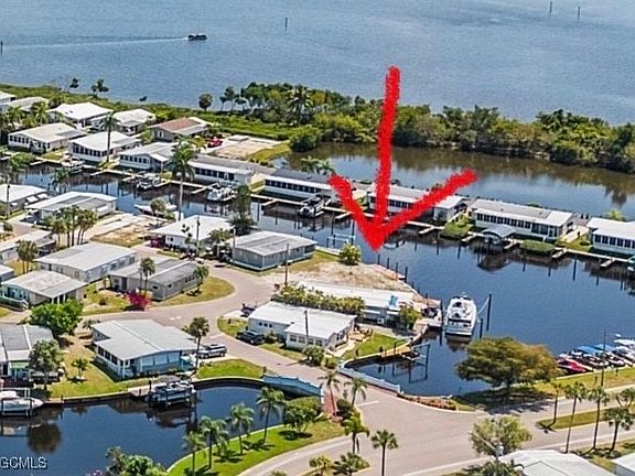 Have you ever Dreamed of Living on an ISLAND?  This is an affordable solution.  Lot with 90 feet of waterfront is waiting for your dream home.  At waterfront is a wooden dock and pilings to pull a nice size boat right in.  Located in sought after Old Bridge Village, a friendly, premier 55+ resident owned community with lots of amenities, activities all year, clubs and entertainment.  There is a fitness center, recreation center, bocce ball, pickleball, shuffleboard, tennis, basketball, putting green, horse shoe pits, new large pool, hot tub, community clubhouse, fishing pier, fish cleaning station, kayak and boat launch and an 81 slip marina.   Drive your golf cart around the community, to and from your activities or to Palm Point, an 8.5 acre greenspace on the riverfront where you can fish, have a picnic, watch the boats or just enjoy the sunset.  This community is a hidden gem with just minutes by boat or car to downtown Ft. Myers and right between 2 airports with approximately 30 minutes to both Southwest Florida International Airport and Punta Gorda Airport.