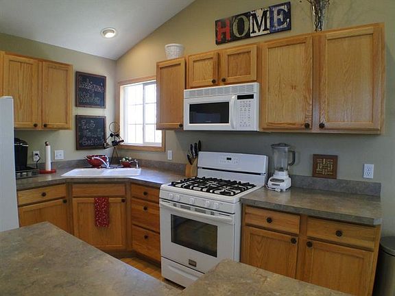 Beautifully decorated move-in ready home! You will not have to do a thing. The main level features an open floor plan with cathedral ceilings. The kitchen includes a center island. Spacious dining and living areas.Two bedrooms and a full bathroom complete the main level. The daylight lower level includes the family room, the third bedroom, the full bathroom and the laundry room. This home is set back off the street and features a deck overlooking the private backyard. Come take a look!