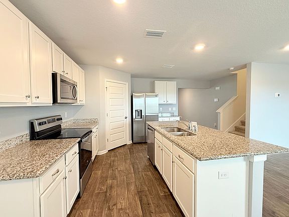 The large, open floor plan includes a bonus room downstairs and an additional loft area upstairs, providing plenty of flexible space for a home office, playroom, or entertainment area. The open-concept kitchen is a chef's dream, including a dining area, large center island with bar seating, granite counter tops, pantry, undermount double-basin sink, and modern stainless steel appliances.