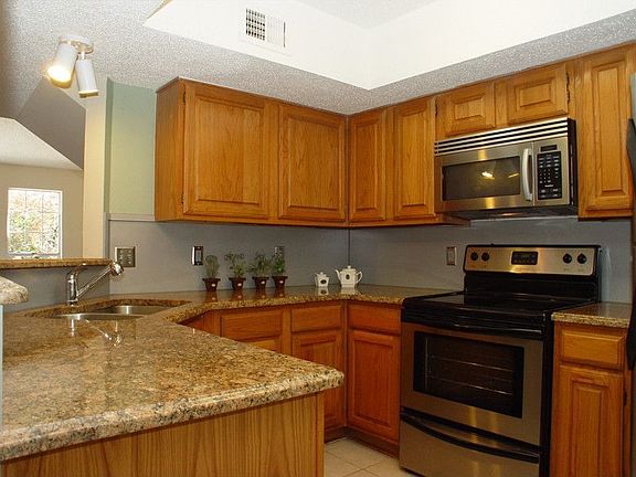 Two bedroom, two bath Condo with view of Creek and Greenbelt plus a one car garage. Kitchen with stainless steel appliances and granite countertops opens to dining & living area with mantled wood-burning fireplace. Master bedroom with walk-in closets. Full sized washer & dryer area. Two large living areas. Neutral colors throughout. Community pool and tennis court. Conveniently located to Addison, Shopping and Dining. Washer, Dryer and Refrigerator to remain. Seller will pay first y...