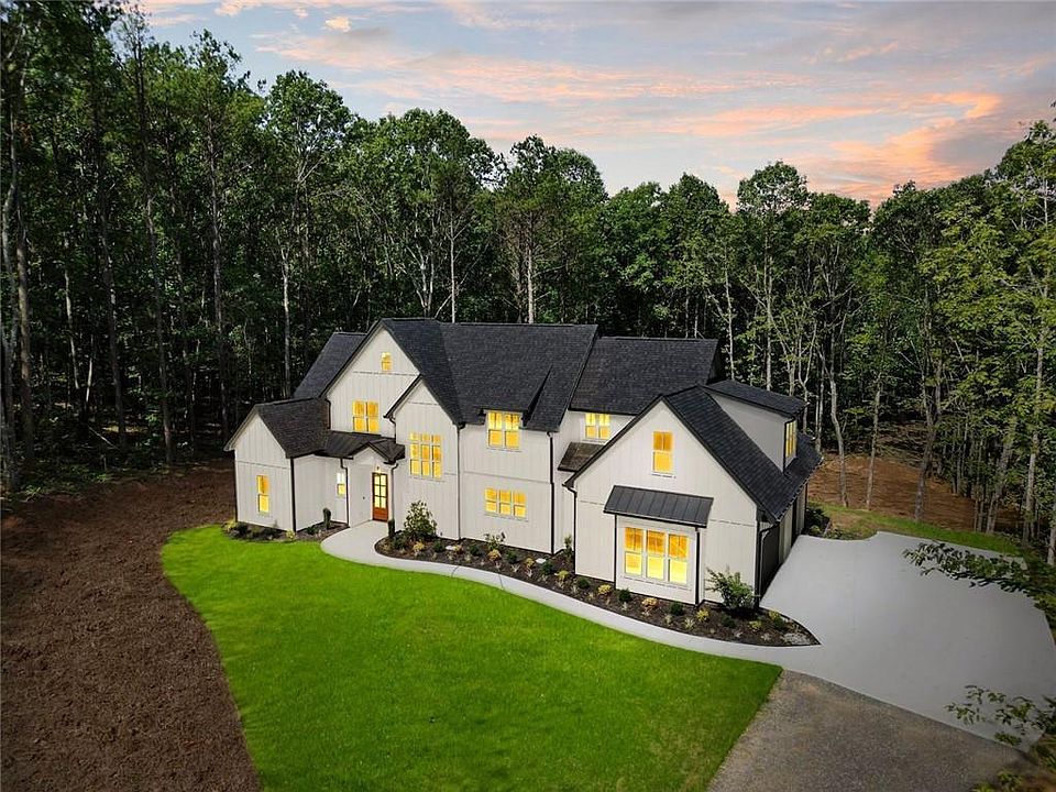 UP TO $8,500 BUYER INCENTIVE USING PREFERRED LENDER. Custom-Designed Retreat on 5.29 Acres - Set on a private, wooded 5.29-acre lot, this custom-designed 5 bed, 4.5 bath home blends modern comfort with peaceful paradise—just 25 minutes from Atlanta. A long, scenic driveway leads to your own secluded sanctuary, designed for space, flexibility, and style. Inside, natural light pours through oversized windows, highlighting an open-concept layout, soaring ceilings, and upscale finishes throughout. The chef’s kitchen features quartz counters, a large island, custom vent hood, walk-in pantry, and direct access from the 3-car garage for easy unloading. The main-level primary suite offers forest views and a spacious retreat, while a second en suite bedroom on the main is ideal for guests or multigenerational living. Upstairs includes three more bedrooms—two with en suite baths—plus a versatile flex space for work or play. Out back, the covered patio invites you to relax, entertain, or unwind by the firepit under the stars. If you’ve been looking for a home that offers space to grow without giving up modern design or convenience—THIS IS IT!