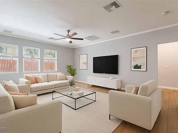 PRIMARY BEDROOM DOWNSTAIRS! AND 2ND BEDROOM DOWN! This rare 4-bedroom, 3-car garage home offers incredible flexibility AND location. Featuring 2 bedrooms on the main level, including a spacious primary suite, step in shower, soaking tub, custom walk-in closet! Second bedroom down is ideal for guests, multigenerational living, or a home office. Enjoy an open, light-filled layout with soaring ceilings, wood-look tile, and a stylish kitchen with granite counters, extended island & stainless appliances. Upstairs, a huge loft is perfect for movie nights, play room or workouts, plus two additional bedrooms and a balcony. Step outside to a low-maintenance backyard with synthetic turf, a brand-new patio cover, and privacy curtains. The finished 2 car and third car garages both have epoxy floors, built-ins, and a TV mount. All just minutes from Mesa Park, Bishop Gorman, top-rated schools, and Ladera’s pool and parks—this is the Summerlin lifestyle at an unbeatable price!