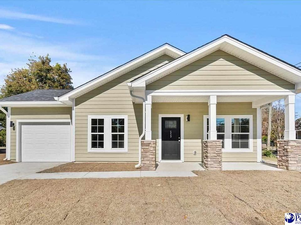 Discover one of Florence’s hidden gems — a beautiful new 3-bedroom, 2-bath home offering modern comfort, thoughtful design and easy one-level living. You’ll appreciate its low-maintenance style and convenient location just steps from downtown. Nestled within an established neighborhood, this community offers the perfect blend of charm, convenience and comfort. Ideal for commuters, the home sits midway between Columbia and Myrtle Beach and is close to local shopping, dining and award-winning healthcare. Step inside to a bright, welcoming interior showcasing a modern craftsman design and a neutral palette. Features include energy-efficient insulated windows that fill each room with natural light, statement lighting, remote-controlled ceiling fans and durable wood-inspired vinyl plank flooring. The semi-open layout flows into a well-equipped kitchen with elegant granite countertops, abundant cabinetry, and a fully equipped appliance package — stainless or black — including range, microwave, and dishwasher. You’ll also find a spacious pantry and generous storage throughout. All three bedrooms are located off the main hallway. The private owner’s suite offers an en-suite bath with double vanity, an oversized shower/tub combination and a large walk-in closet. Two additional bedrooms share a full bath — perfect for guests or family. Outside, you’ll love the charming curb appeal with stylish Hardie plank siding, a welcoming front porch, gutters and freshly sodded yard. This home is move-in ready — don’t miss your chance to enjoy all its comfort, quality, and convenience.