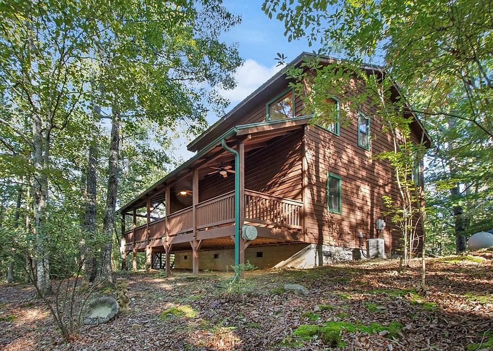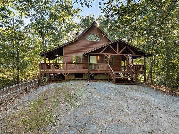 Tucked away at the quiet end of a tranquil road, this charming mountain chalet offers the ultimate peaceful escape in Country Mountain Ridge. This delightful two-bedroom, two-bathroom home immediately welcomes you with warm hardwood flooring that flows throughout. Step inside and be greeted by the dramatic centerpiece of the living space: an exceptional, double-sided, see-through gas-log fireplace. Framed in beautiful, stacked stone that soars to the vaulted ceiling, this feature ensures a warm, inviting ambiance that can be enjoyed from the living, dining, and kitchen areas. A substantial wood mantel, on both sides, perfectly complements the rich wood tones found throughout the home. The main level is designed for convenience, featuring a comfortable bedroom, a full bathroom, and a handy laundry room. The spacious primary bedroom suite occupies the entire upper level including a luxurious attached bath, complete with a jetted tub for soaking and a separate shower. Enhancing your mountain lifestyle are multiple outdoor spaces, including three spacious covered decks and an additional uncovered deck area with a 240V outlet—perfect for enjoying the serene surroundings. Set in a natural setting, this property offers a low-maintenance yard, complete with a spacious fenced area and ample parking options. Experience the height of mountain charm with this beautiful, secluded home.