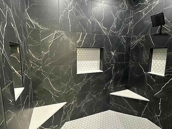 The first level provides a half bath, laundry room, and the primary suite. The primary bath has custom cabinets, quartz countertops, a huge 6 foot shower with a waterfall showerhead and a walk-in closet with built in shelfing.