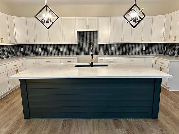 The second story has an open floor plan with the kitchen, living room, half bath and a large pantry. The kitchen has ton of cabinets, a sleek black island with quartz countertops and a ceramic tile backsplash. Off the living room is access to a wraparound deck.