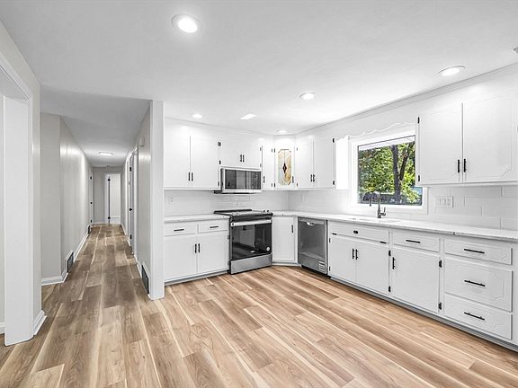 Fully renovated ranch in Longmeadow offering true single-level living with nothing left to do. The kitchen was just updated with bright white cabinetry, new counters, stainless appliances, recessed lighting, and a large window overlooking the yard. The flooring, paint, hardware, and lighting throughout the main level are all new or refinished. Both full bathrooms have clean tile, matte black fixtures, and modern finishes. Three bedrooms on the main floor plus a partially finished lower level with roughly 400 sq ft that works well for a gym, office, playroom, or bonus space. Gas heat, central air, and a new mini split add efficient comfort year-round. The level fenced backyard is great for pets, gatherings, or a future patio. An attached two-car garage and oversized paved driveway provide off-street parking and storage. Close to Longmeadow shops, schools, parks, restaurants, and highway access. Move-in ready, rental potential, or easy downsize with flexible options.