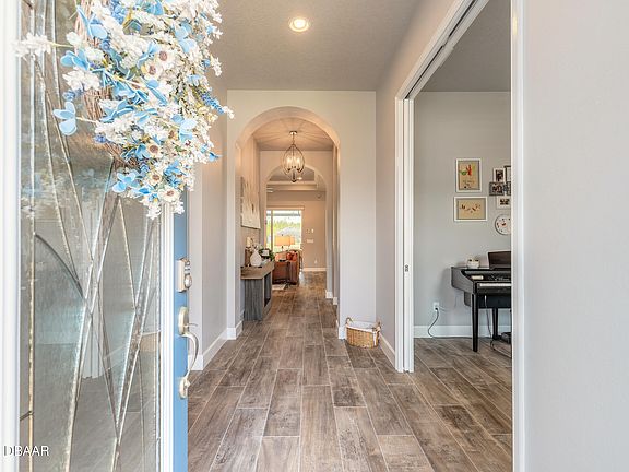 Step into luxury at 557 Mosaic Blvd, a stunning 3-bed, 2-bath smart home in Daytona Beach's premier Mosaic community. Built in 2021, this meticulously maintained and upgraded 1,979 sq ft retreat offers serene water views, tray ceilings, crown molding, custom shiplap walls, wood-grain tile, and a gourmet kitchen featuring a farmhouse sink, double oven, and custom wood shelving.