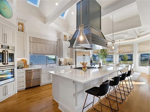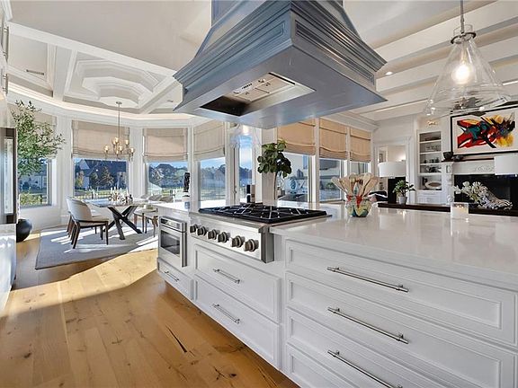 Welcome to 557 N Corniche Du Lac, an exceptional custom residence in the gated community of Maison du Lac. This elegant home features a stunning stucco exterior, gas lantern lighting, and a private gated courtyard that creates a grand first impression. Inside, the home offers refined craftsmanship throughout, including custom millwork, wide-plank wood floors, and soaring detailed ceilings. The gourmet kitchen is designed with a large quartz island, professional-grade appliances, and an impressive custom vent hood, opening to a light-filled dining area framed by panoramic windows overlooking the lake.
