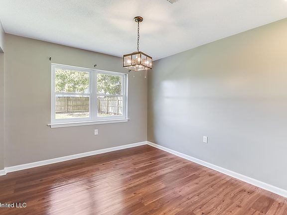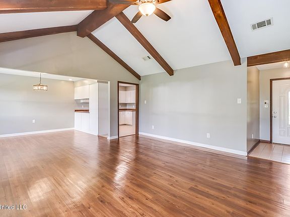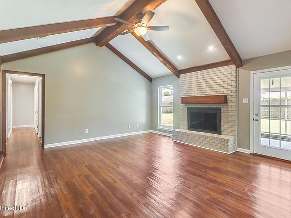 Newly renovated D'Iberville home with a spacious living room showcasing vaulted ceilings, exposed beams, and a fireplace. The kitchen features brand-new appliances, blending style and function. Step outside to a fenced backyard and covered patio, perfect for relaxing or entertaining. Roof 2018.