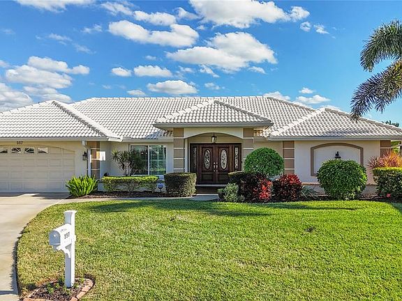 Experience the perfect balance of elegance and ease in this beautifully updated 3 bedroom, 2 bath pool home with a tranquil lake view, tucked away on a quiet cul-de-sac in the highly desirable Plantation Lakes neighborhood at Plantation Golf & Country Club. This community is unique within Plantation, offering remarkably low HOA fees of just $550 per year. From the moment you step through the double wood doors with glass inserts, the home’s warmth and thoughtful design immediately stand out. Expansive views draw your eye straight to the pool and the shimmering lake beyond, setting the tone for relaxed Florida living. Inside, high-end porcelain plank tile floors, plantation shutters, and plush bedroom carpeting create a refined yet comfortable atmosphere. The open family room is an inviting focal point, featuring a beamed cathedral ceiling, custom stone fireplace, and a built-in wet bar with glass shelving—ideal for entertaining. The kitchen blends function and style with granite countertops, custom wood cabinetry, stainless steel appliances, and a pass-through window with serving bar to the pool area. Step outside to a spacious screened lanai surrounded by lush landscaping, where the solar-heated pool and peaceful lake view provide the perfect setting for outdoor living. Quality updates include replacement of most of the windows to impact hurricane windows in 2023, HVAC system (2020), new security system (2023), updated irrigation system (2022) drawing from the lake, and a new pool pump (2024). The pool cage was replaced in 2013 and upgraded with stainless steel screws in 2020, and the water heater was replaced in 2023. Additional gutters have also been added for improved drainage. Optional membership at The Plantation Golf & Country Club offers access to two 18-hole championship golf courses, 13 Har-Tru tennis courts, six pickleball courts, Bocce Ball, a fitness center, Jr. Olympic pool, dining, and a vibrant calendar of social events. This exceptional home captures the essence of Florida living—refined, inviting, and truly move-in ready.