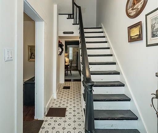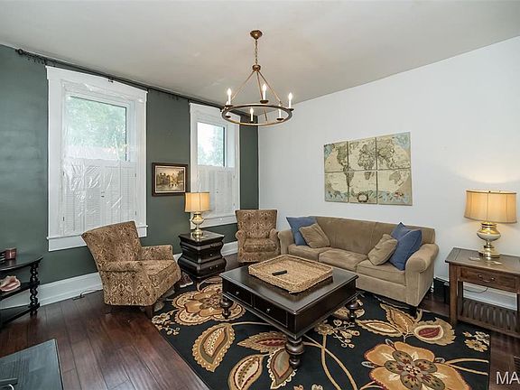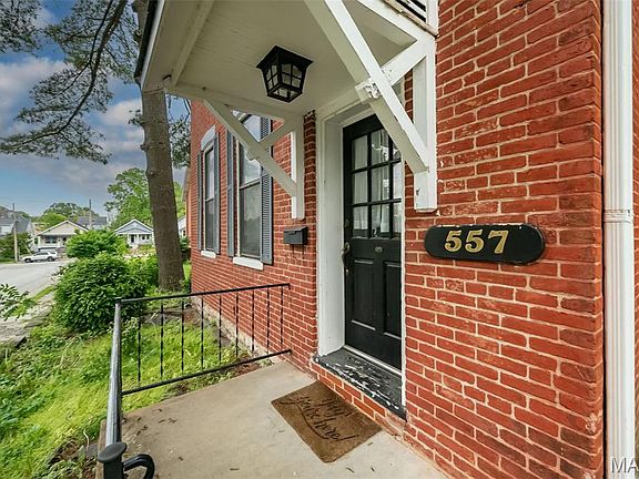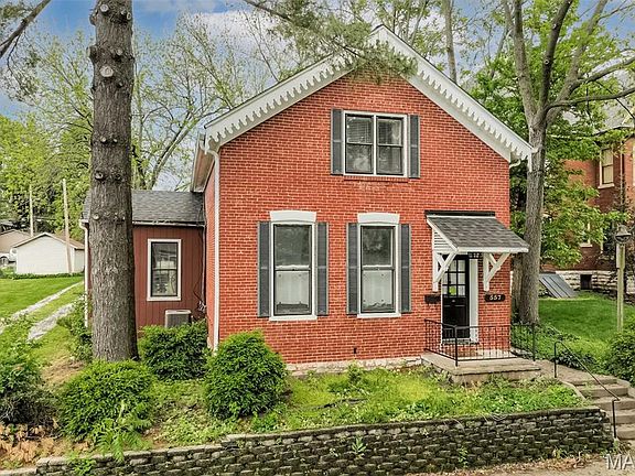 Circa 1867 this charming home was Originally built as a schoolhouse. Walking up to the home notice the antique turn doorbell. The entry foyer greets you with a historic and stunning staircase. Notice the front living room with hardwood floors, 10 foot ceilings, impressive baseboards/trim, tall deep windows, a ceiling fan, built-in storage.Main floor bedroom with built-in closets, a beautifully updated full bathroom, a mudroom with main floor laundry, a sunroom/office, a lovely dining room, and a updated kitchen that looks out to the level backyard and patio.Kitchen offers ample counter space and stainless appliances. Upstairs find 2 Spacious bedrooms with walk-in closets and a full bathroom. The backyard has 2 concrete patios, one off the sunroom, and one in your spacious lot. There is a detached 2 car garage. Seconds Lindenwood University, Streets of St Charles, & the classic restaurants & shops of Downtown Historic St. Charles and the Missouri River Riverfront are a short walk away.