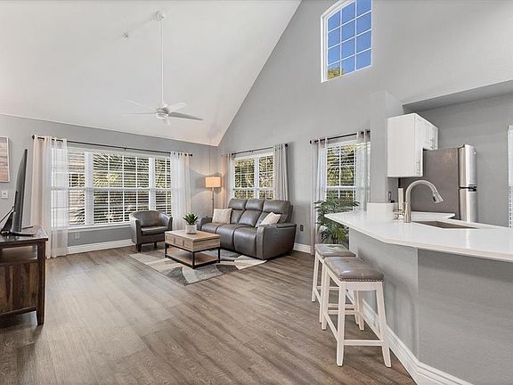 Granite countertopsFresh interior paintLarge windowsOpen floor planVaulted ceilingsModern kitchenHardwood flooring