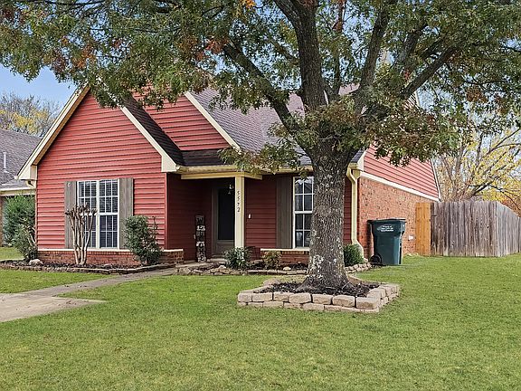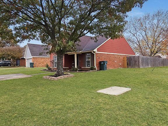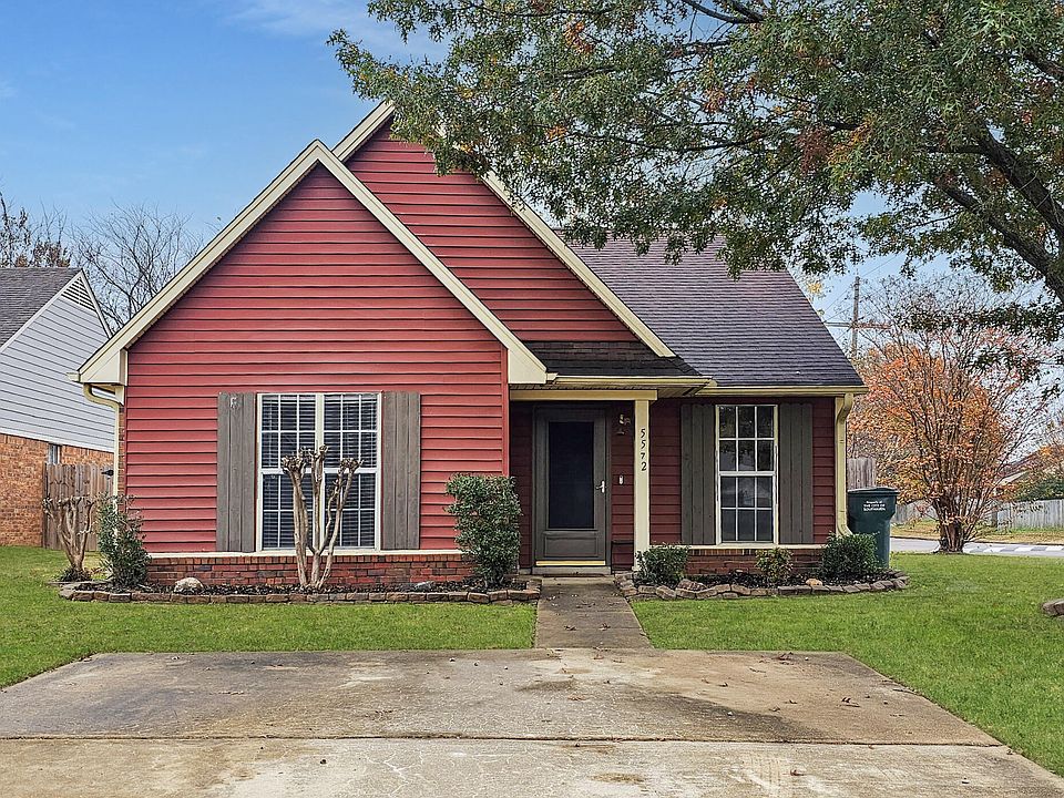 Charming home on a spacious corner lot, perfectly situated near the community playground! Step inside to an open, inviting floorplan featuring gorgeous wood flooring and vaulted ceilings. The great room offers a cozy gas-log fireplace and flows seamlessly into the kitchen, which includes ample white cabinetry, a pantry, and white appliances. The adjoining breakfast area features breakfast-bar seating and a large window overlooking the backyard. The split bedroom layout provides privacy, with the primary suite on one side of the home showcasing a stylish wood accent wall, carpet, walk-in closet, and private full bath. The opposite side offers an additional bedroom and full bath—ideal for guests. Outside, enjoy a large fenced backyard complete with a wood privacy fence, spacious covered patio, and a stone pathway leading to a generous storage shed.