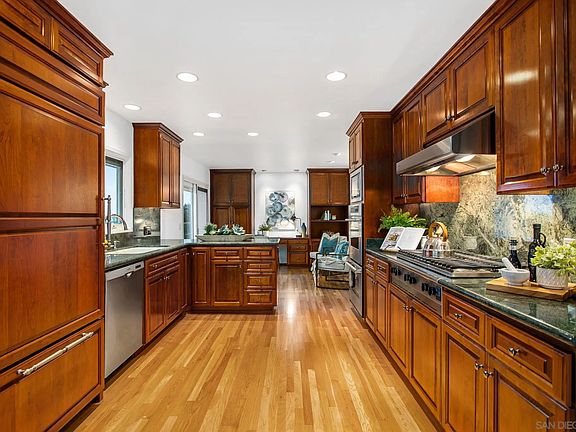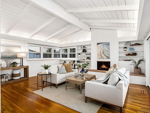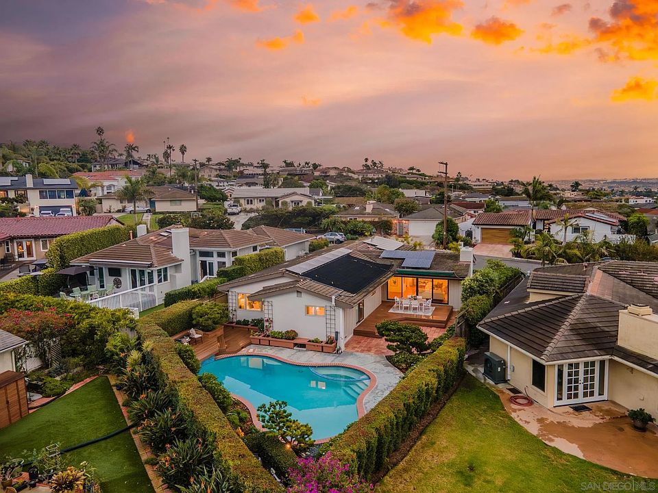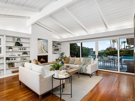 It doesn’t get better than this single-level La Jolla home, ideally situated at the top of a quiet cul-de-sac above Bird Rock! On the market for the first time in over 40 years, this residence offers a rare combination of prime location, thoughtful updates, abundant natural light, and ocean views. Inside, a spacious living room welcomes you with hardwood floors, vaulted ceilings, plantation shutters, and large sliding doors that create seamless indoor–outdoor living. The well-appointed kitchen features custom solid cherry cabinetry, granite countertops, premium stainless steel appliances, a built-in Sub-Zero refrigerator, recessed lighting, and a gas cooktop. A cozy adjoining family room—also showcasing custom cherry cabinetry—opens directly to the home’s private backyard retreat. The front and backyard create a beautifully designed oasis ideal for year-round enjoyment. Relax by the newly resurfaced pool and attached spa or on the updated deck, surrounded by mature landscaping designed by Todd Fry. A poolside waterfall and landscape lighting in both the front and back enhances the resort-style ambiance and sense of privacy. Additional upgrades include owned solar panels, dedicated solar pool heating, updated windows throughout, a replaced and insulated roof (2009), and a newer A/C system with upgraded air ducts. Don’t miss this rare opportunity to make this beautifully maintained La Jolla property your own.