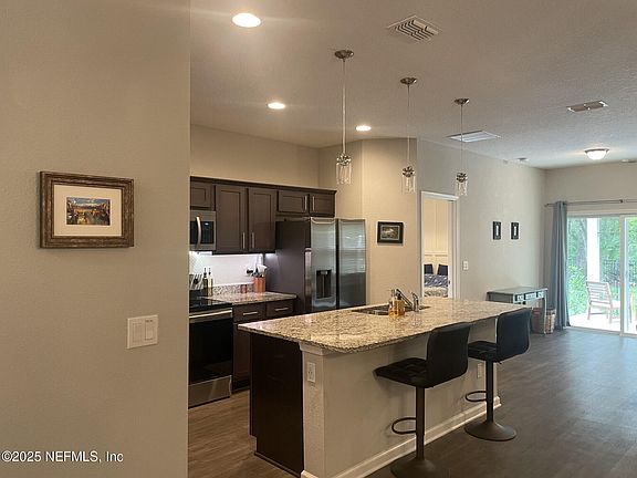 Welcome to one of the newest homes in the Ortega Bluff subdivision. A custom-finished single-family residence built in 2020. This thoughtfully designed property features 4 spacious bedrooms, 2 elegant bathrooms, a den, a two-car garage, a 2,080 sq. ft. of finished living space. With the backyard facing the tranquil Ortega River and the front yard facing a picturesque community pond, you'll enjoy peaceful views and a sense of seclusion from every angle. Every detail has been carefully selected to create a modern sanctuary with sophisticated style. The open-concept kitchen and dining area serve as the heart of the home, perfect for both intimate dinners and lively gatherings. Expect high-end materials throughout with matching luxurious granite countertops in every room, and top-tier appliances. The master suite has a spa-inspired bathroom featuring dual sinks set in a stunning granite countertop. Dream residence for anyone seeking a stylish and new welcoming living space.