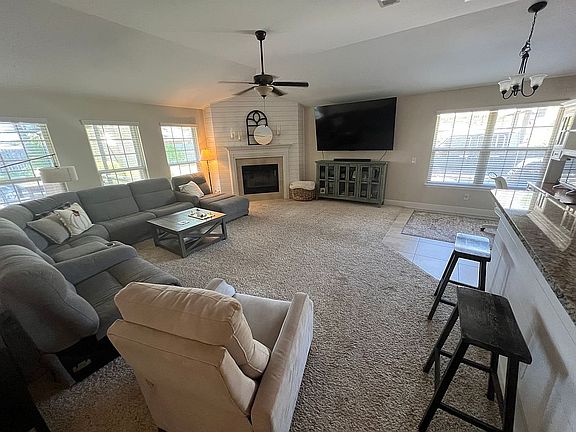 Fireplace surroundShiplap islandGranite countertopsFully enclosed saltwater poolLarge master suiteCalming landscaped backyardAiry open floor plan
