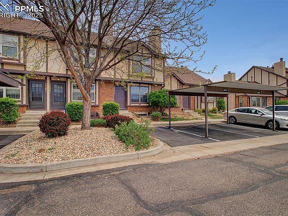 Desirable 2 story townhome with partially finished basement in Pinon Bluffs. This unit overlooks Pinon Valley Park and has a beautiful view of Pikes Peak. New luxury vinyl wood laminate is throughout the main level. New white six panel interior doors accent the freshly painted walls. There is a window seat in the living room to look out over the park and view the mountains. Rustic cedar accents the woodburning fireplace in the living room. The kitchen features new cabinetry, new countertops, and stainless steel appliances. There is a pantry cabinet in the kitchen and another large pantry/closet off of the kitchen by the back door that leads to the enclosed patio and storage closet. A dining area off of the living room and a half bath complete the main level. Upstairs, there are 2 master suites, one with its own 3/4 bath and the other shares the hall full bath. Skylights in both bathrooms provides natural light. The carpeting and pad is new on the upper level and also in the rec room in the basement. There is also a large unfinished portion of the basement for storage and it includes a laundry area with a sink. The laundry used to be on the main floor where the pantry coset is. With an acceptable offer, the Seller will reinstall the plumbing and electrical in the pantry closet so the buyer can have a main level laundry. There is covered carport parking in front and guest parking as well. Ready to move into-check it out today!