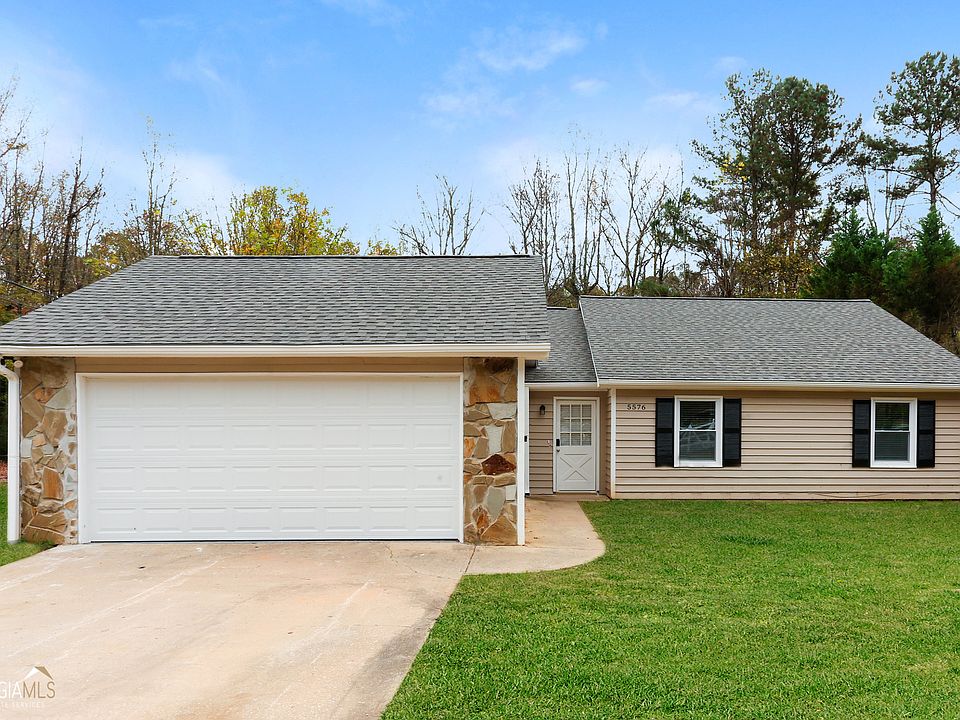 Beautifully renovated 3 bedroom 2 bath ranch home in Oxford Place. This is a great opportunity to get into a wonderful Norcross subdivision that is well-kept but has no HOA. This home has a 2-car garage and stone accents on the front. Once inside you will be amazed. This home has all-new flooring, high vaulted ceilings in the great room with a cozy fireplace, a separate dining room, and a renovated kitchen with stone countertops and stainless steel appliances. The same new flooring was put down throughout the entire home and everything has been freshly painted. The bathrooms have also been remodeled. There is nothing left to do here except to bring your belongings and move in! This home has a large private backyard with a view of trees. It doesn't get much better than this!
