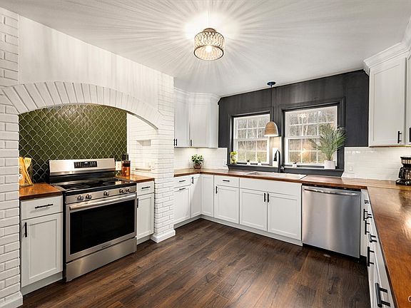 The brand new kitchen features white shaker cabinets, crown molding, hazelnut-stained butcherblock countertops, a subway tile backsplash, undercabinet lighting, and a striking green mosaic accent wall framed by a painted brick arch alcove for a custom touch. The dining room includes built-ins, and the adjoining formal living room feels bright and inviting thanks to brand new oversized windows. Just beyond, the home’s architectural centerpiece comes into view: a beautiful curved staircase with a custom wrought iron railing.