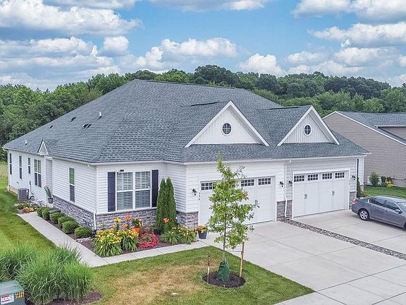 AMENITIES AMENTIES AMENITIES!!! This meticulously maintained home is in the popular Whispering Woods 55+ community, built by McKee Builders. The community features a community pool, bocce court, pickle ball court, yard maintenance, trash, fitness center, just to name a few. This home truly has curb appeal with its colorful and mature landscaping. The home features luxury vinyl floors on the main level excluding bedrooms(carpet), a large 10 x 4.5 kitchen island with granite countertop, stainless appliances, and 42 inch white cabinets. This open floor plan is perfect for entertainment! You will find California Closet custom-built shelving in the kitchen pantry and master suite closets, and Hunter Douglas shutters in all windows . The main living area has custom built-in shelving with crown molding and custom paint throughout the home. The crawl space is conditioned and has concrete flooring with plenty of extra storage along with a water booster system that provides increased water pressure to the entire home. The backyard patio is perfect for grilling and entertaining, as you overlook the lushly landscaped backyard backing to woods that will never be built on.
