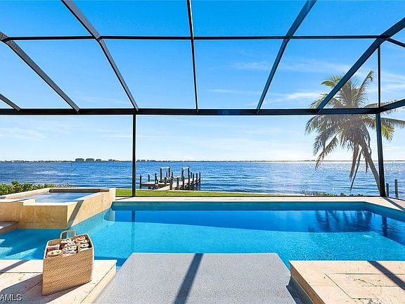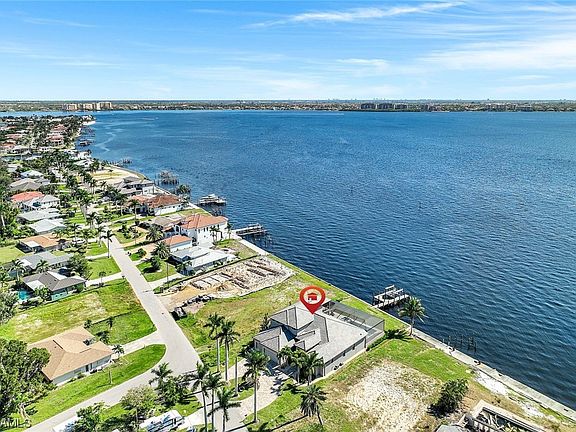 Stunning Riverfront Home in the Yacht Club. Panoramic water views await you from this Newer 2015 home featuring 3,826 SF and 5 Bedrooms 4 Full Bathrooms, and a 3 Car Garage. The best materials used, travertine & wood flooring, high ceilings, impact windows & doors, and breathtaking views throughout. RARE - SOUTHERN EXPOSURE for the most daytime sunlight on the pool AND looks down the length of the River versus just across it. Few streets have a BIG VIEW like this on the River. Open Living Room with coffered ceilings & sliders overlooking the River. Kitchen with dark cabinets, stainless appliances, and gorgeous dining space. First floor master suite - wake up each morning to endless water views! Large guest bedrooms w/ en-suites. 2nd Master Suite upstairs w/ private balcony along with a 2nd guest bedroom which could also be a theater room, office, 5th bedroom, or home gym. Home features 3 bed 2 bath down stairs and 2 bed 1 bath upstairs. Modern Pool with sun ledge, hot tub, and waterside deck space! Few streets have a BIG VIEW like this on the River. Impact windows, additional electric storm screens remote operated in back, BRAND NEW tile roof, new dock, 14K boat lift, new pool cage, fresh landscaping. Offered Turnkey - Furnished - most interior from West Elm & patio set from Lafuma (handcrafted in France). No water from Ian, just some exterior damage that was all repaired or replaced promptly. A remarkable home located near Cape Coral's only Beach, Dining, and Shopping! Located in the highly desirable Cape coral Yacht Club. BUY WITH CONFIDENCE knowing the home has been appraised AND inspected - Home passed both with flying colors. Opportunity knocks to purchase a stunning new home with big water views (rare for the yacht club). THE YACHT CLUB is located within a 5 mile radius of 3 large projects: Bimini Square, The Cove at 47th, and all new Yacht Club offering more shopping, restaurants, Lee Heath facility, and more. Watch your investment grow while enjoying all the new amenities coming into the Yacht Club area or Cape Coral.