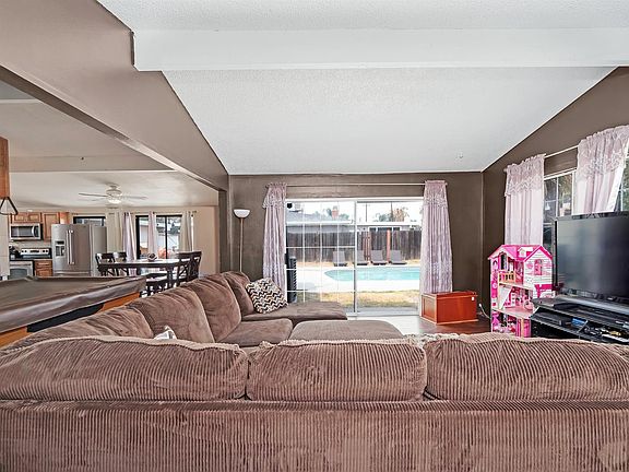 It's all about the land which is almost acre with a swimming pool right off the kitchen patio. This Mid Century Modern'' home was built in a time when outdoor living was part of the living space. All doors and windows look and lead out from the living room and kitchen onto the cemented patio and pool area. High vaulted ceilings with high angled windows create a unique architectural feature and bring light into the newer kitchen and bathrooms. The granite counters and new slip resistant tile floors make for easy care. This house is perfect for a large family or even an investor who is interested in restoring a historic home that a movie star once owned; actor Tony Burton who played Apollo Creed's trainer in the movie Rocky!