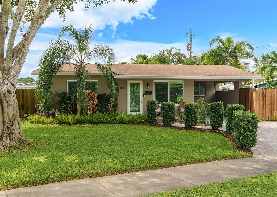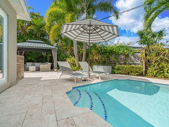 Located within the heart of Wilton Manors, this meticulously renovated two-bedroom, two-bath home boasts more than $150,000 in upgrades. Kitchen showcases solid wood cabinets, quartz countertop with waterfall edge, stainless steel appliances, and restored terrazzo floors. Both bathrooms feature high end fixtures and Porcelanosa tile. The air-conditioned Florida room offers walls of glass opening onto the fenced yard. Entire heated pool and surrounding area has beautiful new travertine surface and a cabana for shaded comfort. Lush landscaping with accent lighting surrounds home including pool area and secluded side yard for those quiet evenings. Additional updates include impact glass throughout, driveway pavers, updated electrical panel, new AC 2018. The home is designed for easy living.