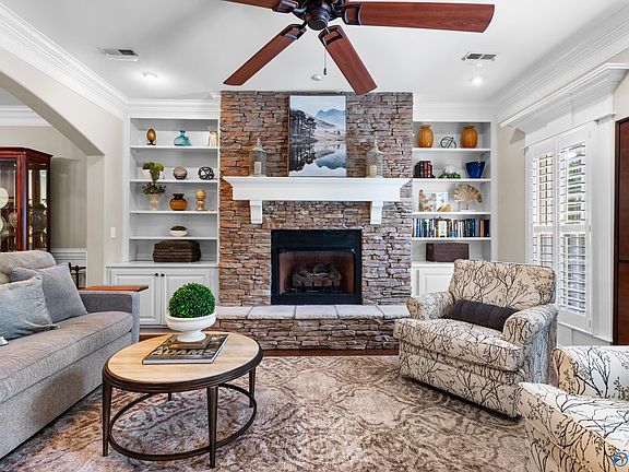- Features: 10’ + Ceiling, Ceiling Fan(s), Fireplace, Wood Floor, Built-in Features