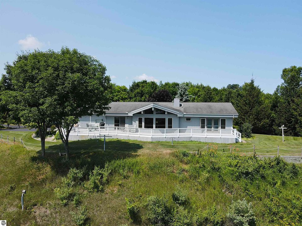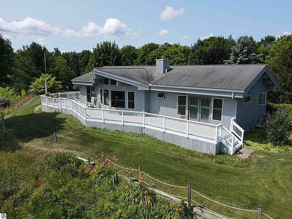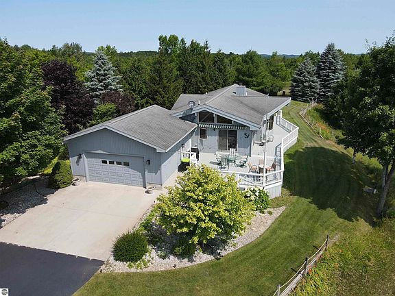 Welcome to this Leelanau county Lindal home sitting on 2 beautiful acres. You don’t want to miss out on these stunning panorama views of Lake Leelanau. This meticulously maintained residence offers 2 bedrooms and 2.5 bathrooms, with a spacious open floor plan. Step inside and you'll be welcomed by a cozy atmosphere. The main level features nearly 1,600+ square feet of living space. The lower level is ready to double your square footage or offers you unlimited storage. Structural design plans are already done and available to the buyer along with the uninstalled egress windows. To extend your living and entertaining space step outside to a 1000 Square foot deck that looks out over Lake Leelanau. There is a wonderful retractable electric awning to give you shade and protection. Beautiful garden beds and natural landscape compliments the property along with an in-ground sprinkler system. This home has an oversized attached 2-car garage with an additional storage shed. Improvements include a recently sealed driveway and bathroom remodel. For your convenience of turn key, this home comes furnished and is ready for its next owner. Centerville Township does allow short term rentals but should be verified by buyer.