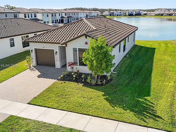 LAKE FRONT LOT - Discover resort-style living in this stunning 2022-built lakefront home, where you can wake up to breathtaking lake views every day. This bright, open-concept home is designed for both comfort and style, featuring upgraded that include quartz countertops, impact windows, stainless steel appliances, and blinds throughout. Nestled in a premium lakefront lot, this home offers not just beauty, but also convenience. Enjoy top amenities, including a clubhouse, resort-style pools, fitness center, tennis and pickleball courts, golf course, BBQ/picnic areas, a dog park, and community events. The Town Center serves as the heart of the community, offering easy access to shops, restaurants, salons, and a supermarket.