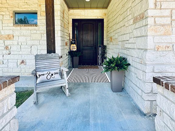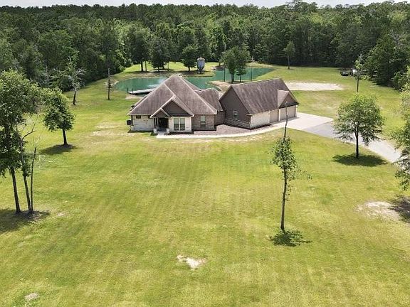 This custom-built home is one of a kind and sits on 5.6 park-like acres and offers charm, luxury, and a beautiful design throughout. It features 4 spacious bedrooms—3 downstairs and one upstairs, perfect for 4th bedroom or ganeroom (has a closet). Primary suite includes entrance to a large covered patio, private bathroom with soaking tub, walk-in shower, and a dream closet with built-in island dresser. Chef's kitchen provides all the amenities with granite countertops, large island, stainless appliances including double oven, walk-in pantry, abundant counterspace and a great big dining area. Kitchen overlooks living room with high ceilings and a stone accent wood-burning fireplace and lots of natural light provided by the windows across back of home. Interior laundry room with room for extra fridge or deep freeze, half bath, 3 car garage. Outside, enjoy a Blue-green pond with fountain, perfect for swimming or relaxing. This immaculate property is built for comfort and entertaining!