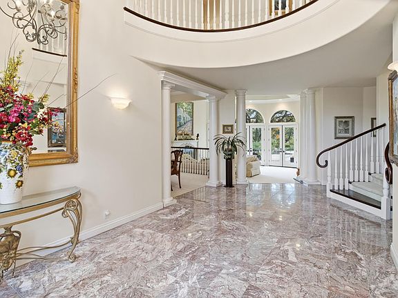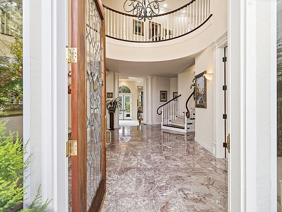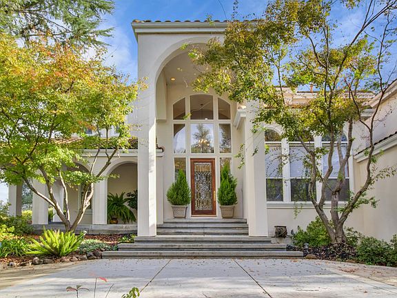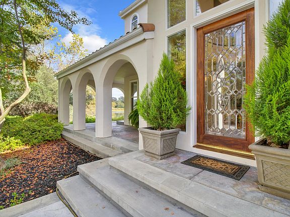 Nestled on two acres, this elegant four bedroom, four-bathroom home boasts thoughtfully designed living space. The home's spacious exterior is complemented by lush landscaping, creating a tranquil and visually appealing setting. The architectural details, including ornate woodwork and arched windows, lend an air of sophistication to the property. The expansive windows throughout the home allow for abundant natural light, highlighting the elegant finishes. The spacious layout includes a primary suite with private balcony offering scenic outdoor views. The office/library offers beautiful built in bookshelves, providing ample storage and display space and features access to a hidden wine cellar. The gourmet kitchen overlooks the family room and features abundant countertop space, a large granite island creating an ideal environment for culinary pursuits. The home also offers a formal living room and dining room, along with a Flex room that could serve as a home gym, playroom, theatre room or additional living space. Outdoors, the property boasts a scenic waterfront setting on a tranquil pond, a spacious yard, built in pool and spa and multiple covered patio spaces, offering ample opportunities for relaxation, dining, recreation and entertaining.
