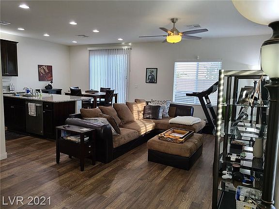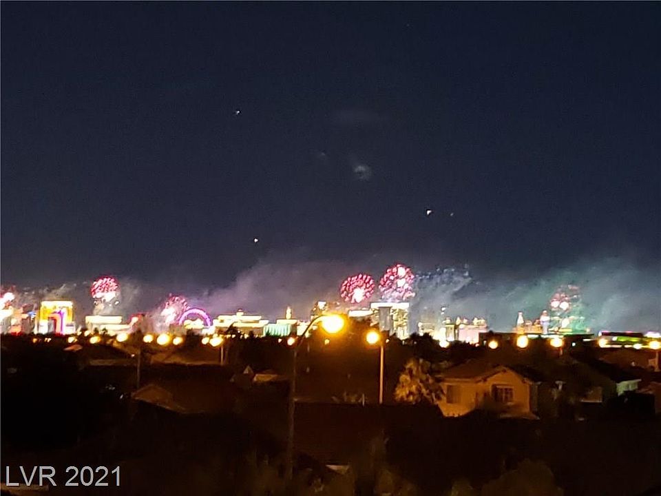PANORAMIC LAS VEGAS VIEWS from the Strip to the Mountains & everything in between! This house has it all: waterproof vinyl planks throughout downstairs, upgraded kitchen w/ granite countertops, dark wood cabinets, stainless steel appliances, & cabinet uplighting, see through pantry, nest thermostats & cameras, alarm system, keyless combo entry, water softener, tankless water heater, modern ceiling fans throughout, solar panels, & rooftop view deck w/ BBQ stub. Upstairs has a big loft that can be used for a second living/TV room, office, or an exercise area separating the Primary Bedroom from the other two bedrooms. From there, walk up the stairs to an unbelievable rooftop deck that can be set up for a perfect third living space for entertaining outdoors w/ the incredible 360-degree view of Las Vegas. Community is conveniently located in the booming SW near the 215 & Buffalo exit, a new live/work/play development, IKEA, The Bend, etc. Large back & side yard big enough for a kidney pool.
