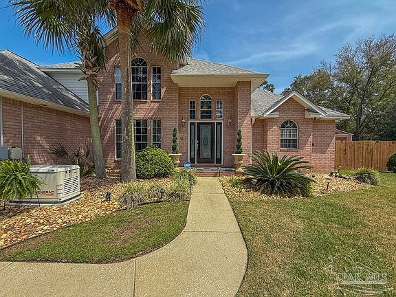 Welcome to your island paradise on the coveted Innerarity Island, where luxurious living meets serene waterscapes. This enchanting property features a glistening saltwater pool, elegantly enclosed with a screen, offering waterviews that epitomize tranquility. Surrounded by exquisite tropical landscaping, this high and dry haven boasts an impeccable flood-free history. As you step inside, the grand living room captivates with its towering ceilings, expansive windows, rich hardwood floors, and a cozy fireplace that invites relaxation and gatherings alike. The seamless flow leads you to a spacious kitchen, a culinary enthusiast's delight, featuring stainless steel appliances, gleaming granite countertops, real wood cabinets, an island, and a charming breakfast nook. Adjacent, discover a quaint screened-in sun porch—a perfect retreat with a convenient half bath, ideal for those enjoying the inviting poolside oasis. The ground floor master suite is a sanctuary of luxury, offering an expansive bathroom with a garden tub, separate shower, and dual vanities and closets, ensuring a peaceful and private respite. Upstairs, three additional bedrooms provide ample accommodations, with one enjoying its own ensuite and a Jack and Jill bathroom serving the others. Outside, discover the expansive backyard, housing a brand new "she" shed for your creative endeavors. Additional upgrades include a 3-year-old architectural shingle roof, a state-of-the-art natural gas standby generator, and a new impact-rated patio sliding door. Enjoy the benefits of a fully equipped smart home with ADT security, programmable HVAC controls, and a Rain Bird sprinkler system for effortless living. A lush greenbelt borders the property, granting you access to Perdido Bay, perfect for paddleboarding or kayaking adventures. Experience the pinnacle of island living—schedule your private tour today and fall in love with your dream escape!