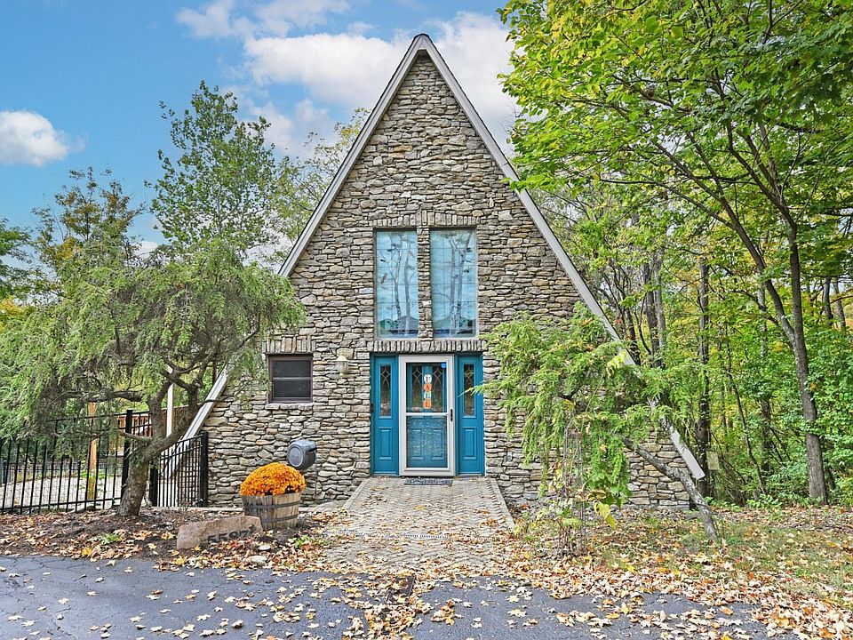 Stunning stone A-Frame situated on 3.10 acres down a long private drive with updates galore!! Custom stonework, hardwood floors, beamed ceilings, a full finished lower level and updated kitchen and baths. This tranquil setting offers an abundance of natural beauty, wildlife and privacy. First floor laundry, oversized garage and great outdoor entertaining space, including a covered deck and paver patio fit perfect for any lifestyle. The ideal mix of country living but with the close proximity to highways and entertainment. You will not be disappointed in this special home.