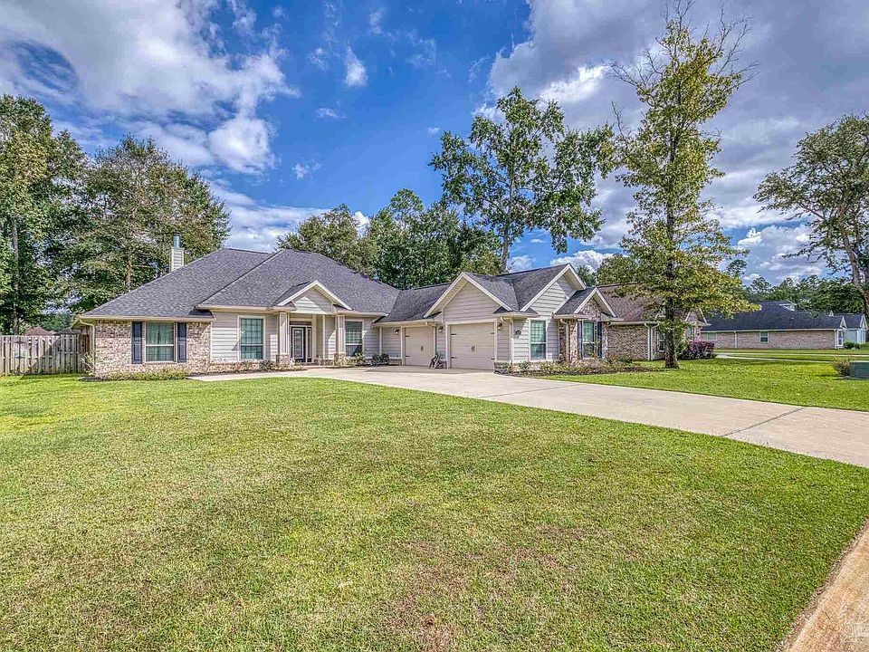 Exceptional home choice in coveted neighborhood of Stonechase. From gated entry to abundant greenery of trees galore, & all amenities that the Pace community has to offer, create an un-parallel location. This Craftsman 4-bedroom, 3 bath home has room to spread out or room to grow. Beautiful leaded glass doors open to foyer & expansive great room ahead. As you enter the home to the right is the spacious formal dining room with trey ceiling & updated lighting, to the left is the office. It features trey ceiling with fan. Both the dining room and office have large windows that lets in tons of natural light. The great room features high ceilings with fan, center fireplace. Built-ins with bookshelves added beside the fireplace. Double French doors access large porch & back yard beyond. The porch has 2 large ceiling fans & two outlets for TVs for football enjoyment. The chef’s kitchen is a true masterpiece, showcasing beautiful NEW white quartz countertops ‘25, an abundant of cabinets create bright & cheerful workspace, a backsplash, & top-of-the-line stainless appliances. Smooth surface cooktop, double oven, built-in microwave, & dishwasher, plus pantry. Everyday meals are enjoyed at a breakfast nook with view of backyard. Large laundry room is conveniently located off kitchen, cabinets and large closet for storage. The primary suite is located on the right side of home which features a generous size, tray ceiling & fabulous bath! Double vanities with quartz countertops in ‘25, garden tub, separate shower & water closet. You’ll love huge walk-in closet! Additional 3 bedrooms are on the opposite side of home & are more than adequate in size & have great closet space. Towards the front of the home are two bedrooms & a hall bathroom. There is a bedroom in the rear of the home that has its private bath, making this perfect for the guest room. Front yard is nicely landscaped with two car oversized garage & back yard has both trees & lawn with a privacy fence, sprinklers.