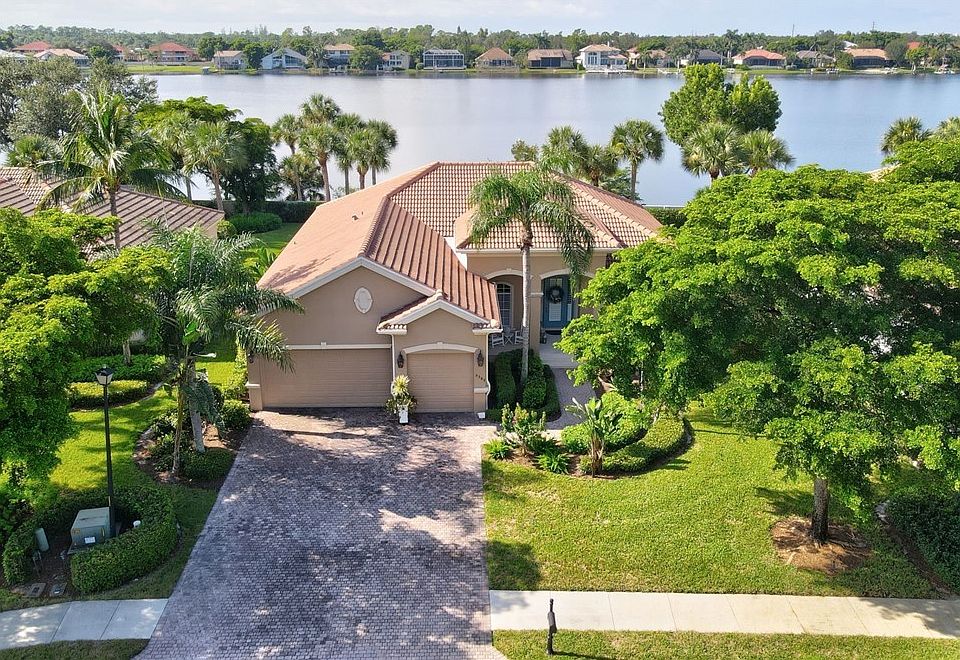 SPECTACULAR WATER VIEW and Southern exposure!! 4 Bedrooms, 3 full baths, great room, formal dining room, all rooms tiled, completely remodeled new kitchen, new granite and new appliances, new A/C Feb. 2025, newer interior paint and exterior paint, newer roof (2023). Custom Spa Screened Enclosure Features Michael Phelps Legend LSX 800 Master Spa with dream lighting and spa umbrella all with lake view (see Virtual Tour #2); ALSO, Community Pool and Fitness Center, PLUS 3 car garage (extra deep) with beautiful paver driveway and built-in storage in garage! PLUS gorgeous waterfront view PLUS gated community! High ceilings in every room, 8' sliding glass doors, tile roof, curb appeal, shutters (manual) except electric on lanai and front door, 2 closets in Master Bedroom (1 is walk-in), split plan with Master Bedroom with huge bathroom ensuite on one side of house and three bedrooms, two additional full bathrooms on the opposite side, Spa enclosure has access to one bathroom and the other two bedrooms share a bath (Jack & Jill)! Gorgeous home, very "inviting", a great place to live! Plenty of room if a private pool is desired! Whole=Home generator hook-up stays but generator does not convey.