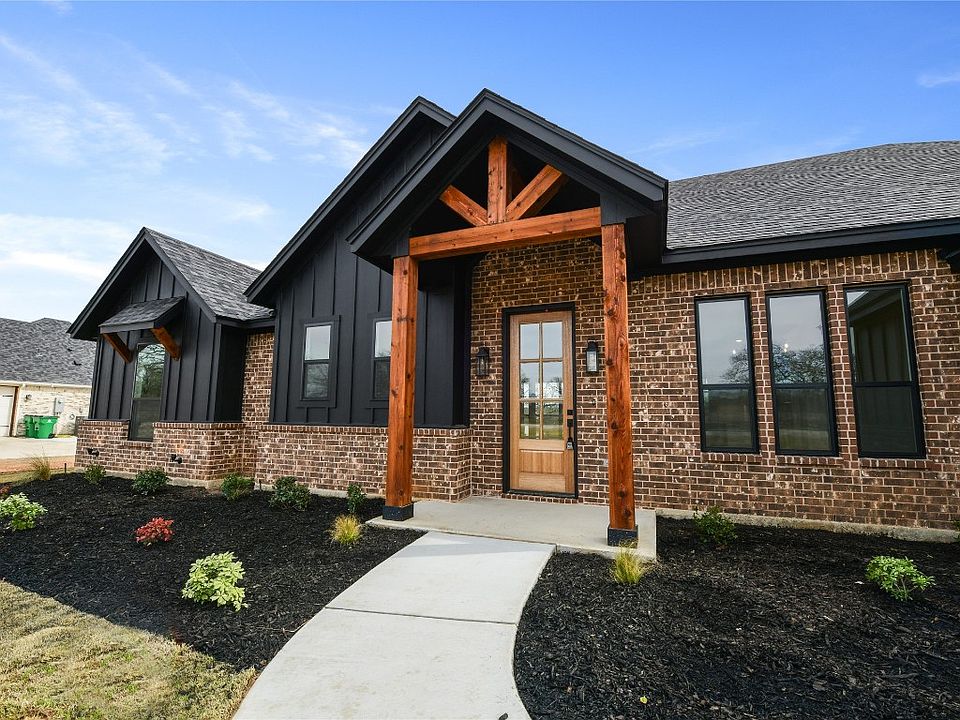 Located within the highly esteemed Brock Independent School District. Welcome to this stunning new construction home, where modern luxury meets farmhouse charm. This open plan offers the perfect canvas for you and your family. Step inside and experience the seamless blend of contemporary design and rustic farmhouse accents. The vaulted ceiling enhances the sense of space, creating an airy and inviting ambiance. You will enjoy preparing meals in this dream kitchen with designer touches. Working from home is a breeze with your own private office. Master suite is a true sanctuary, featuring a walk-in shower and a freestanding tub, perfect for unwinding. With the slab freshly poured in July 2023, you can trust in the craftsmanship and durability of this brand-new home, offering modern amenities and energy-efficient features. Act now to customize the finishing touches to reflect your personal style and preferences. Located with quick access to i-20. Property is great for FFA & 4H kids!