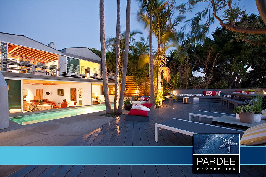 Stunning Architectural compound by Robert Thibodeau/DU Architects, on an over sized 10,000 sq.ft lot. The indoor/outdoor living experience is complete w/ water features, fire pits, a sparkling pool & entertainment decks. This 5 bdrm/ 5.5 bath home is over 4,100 sq ft. w/ breathtaking head on mountain views. Refined w/ warm, modern details such as exposed beam & redwood ceilings, a gourmet kitchen w/ Caeserstone counters, stainless steel appliances & ocean blue Ann Sacks tiles. Spacious bedrooms & dual master suites on each level, complete w/ views of the mountains, pool & beautiful Palm & Eucalyptus trees while maintaining complete privacy, designer baths w/ stunning finishes & fixtures. The downstairs consists of an additional family room w/ private office, polished concrete floors with radiant heat, to warm your toes after a dip in the pool. Minutes to the Village, beach & Temescal Canyon. True perfection all the way around.