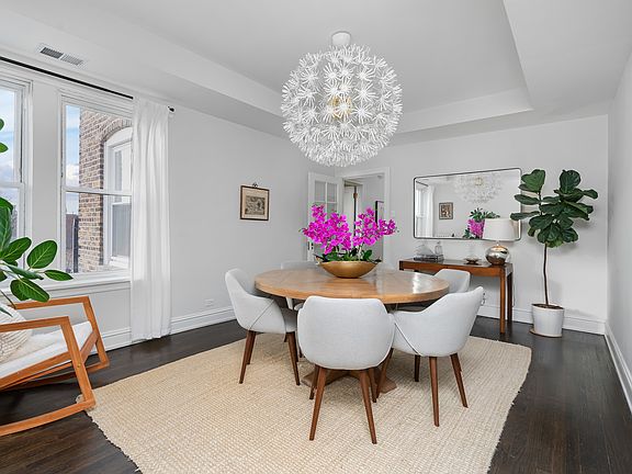 Discover true luxury vintage living with all the modern conveniences in this Georgian styled expansive top floor 2 Bed 2 Bath retreat within the city. Positioned just a stone's throw away from the coveted Nettelhorst school, this home is a gem in the heart of East Lakeview. As you step inside you will discover light bursting from the oversized windows in every room illuminating the space. This corner unit boasts unobstructed views from every direction. Enter through the foyer to the enormous living room featuring a refined fireplace adorned with a marble surround. Continue down the hallway to discover a sunlit, separate formal dining room - a perfect setting for intimate gatherings or can be used as an optional family room off the kitchen. A restored butler's pantry brings you into the modern kitchen with all stainless-steel appliances including a wine fridge and white cabinetry. Enjoy the eat-in kitchen area with skylight or convert it to a home office or reading nook. A perfect grilling area is just outside the back door. The spacious primary suite, encompassing the northwest corner of the unit creates a uniquely private retreat and is lined with a wall of windows, ample closet space, and a library/home office nook with a vintage decorative safe and custom shelving. A generous second bedroom is perfect for guests and includes a large closet and newly gutted bathroom with gorgeous custom tile, glass shower partition, new vanity, and Japanese bidet toilet. Vintage enthusiasts will appreciate the curated details, from intricate crown molding and baseboards throughout, a tray ceiling, butler's pantry, timeless fixtures, dark hardwood floors (and more) adding a touch of grandeur. Additional perks include in-unit laundry and ample in-unit storage. Plus, a huge walk-in private storage room and separate bike room in the building. A large shared brick patio in the back is perfect for summer gatherings and entertaining. Not to be overlooked is the primer tandem attached garage parking space, the only parking in the building plus many recent improvements including the only unit with a new ac system. Well maintained 6 unit building with a newly installed keyless AlphaTouch entry system, a must for all your packages. Steps away from it all - Wrigley Field, shopping, local eateries, and nightlife. Ideally located a half-block from the Lakefront, bike trails and convenient access to CTA train and buses.
