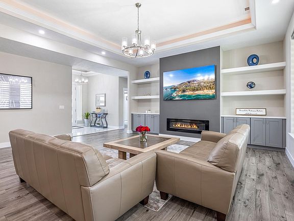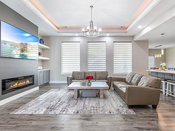Cozy fireplaceCovered extended patioModern homeContemporary style custom cabinetsPerfect kitchen islandHigh ceilingsLuxurious primary suite