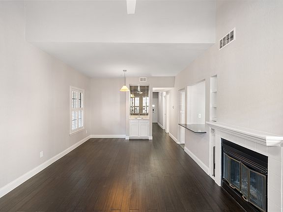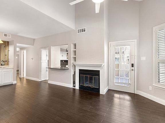 This Mediterranean-style condo in Dallas features 2 bedrooms and 2 full bathrooms. The renovated single-level, first-floor unit is move-in ready and it offers a lock-and-leave lifestyle. The open floorplan flows easily for modern living. Beautiful French doors lead from your kitchen to your covered patio for all day enjoyment. You'll love having the wood-burning fireplace, vaulted ceiling, plantation shutters, sleek dark bamboo floors and new tile in the remodeled kitchen with new quartz counter top. Add on a private covered patio and an attached one-car garage, you will love this home! The spacious primary bedroom has a gorgeous ensuite renovated bathroom and the second bedroom has an updated bathroom as well! Also, the hallway closet has hookups for a full-sized washer and dryer. Enjoy the community pool and hot tub without the worries of maintaining them! Conveniently located near the LBJ Freeway and the Tollway.